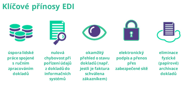 Elektronická výměna dat neboli EDI (electronic data interchange) řeší bezpapírovou komunikaci mezi obchodními partnery. Společnosti si prostřednictvím EDI elektronicky vyměňují doklady, jako jsou objednávky, dodací listy, faktury ve strukturované podobě přímo mezi rozdílnými informačními systémy (např. Pohoda, SAP, Money, Abra atd.). Odpadne díky tomu manuální zpracování dokladů a chybovost s tím spojená.